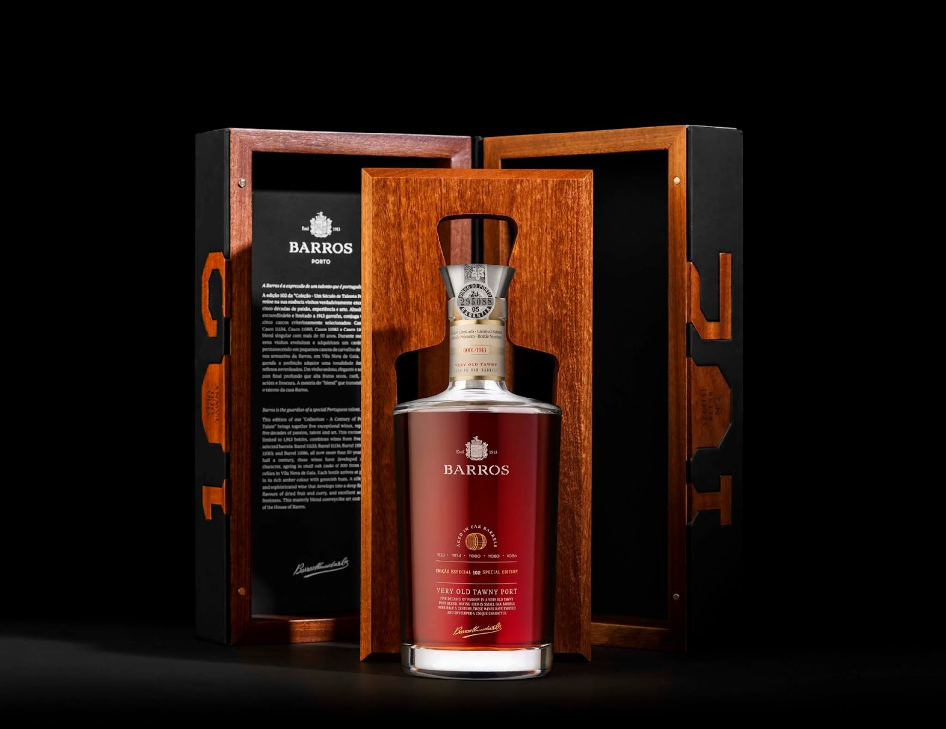 This limited edition Very Old Tawny port is blended from five different vintages from each decade from the 1950's to the 1990's representing 5 decades of wine making passion, talent and art. Having aged in small oak barrels over half a century, these wines have evolved and developed a unique character. This exclusive blend is limited to 1913 bottles only! Barros Special Edition 102 – Very Old Tawny completes the trilogy of wines that make the collection “A Century of Portuguese Talent“, created to celebrate the first centenary of the House of Barros, established in 1913.