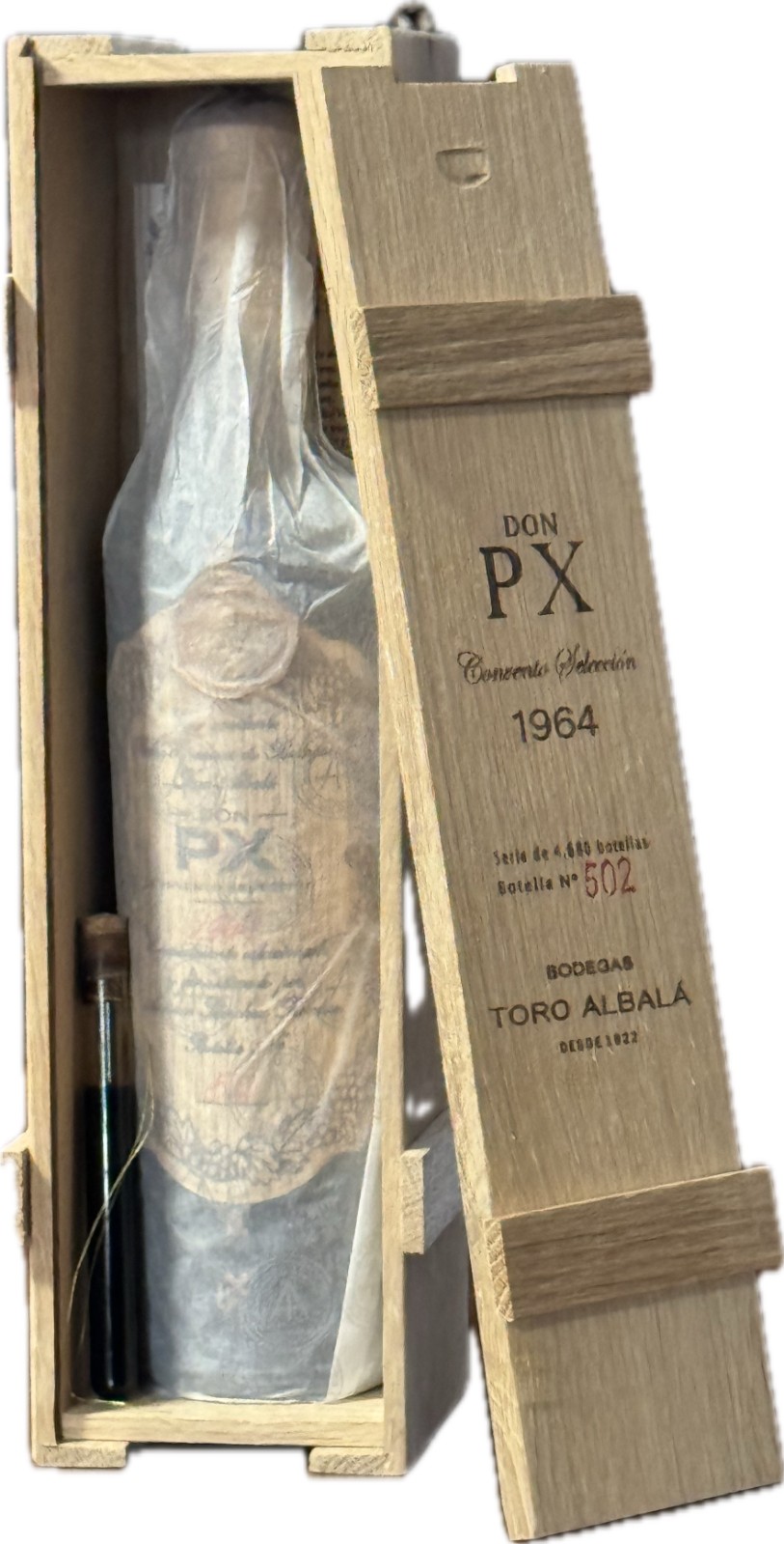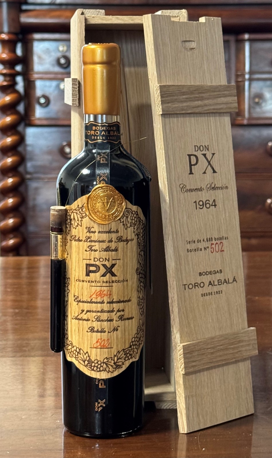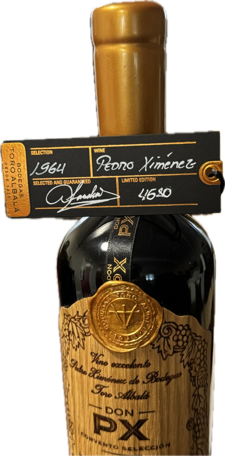 "My favorite of all the old sweet PXs I tasted this time was the perfumed and showy 1964 Don PX Convento Selección, which still has the wooden label, but it has also been modernized and made easier to read. It is denser than any of the other wines and has a brighter edge, amber, because the center is opaque and black. It has an incredible perfume; it's floral and spicy with fresher aromas than I remember in the other sweet PXs. It fills your mouth, goes down your throat like liquid gold and explodes in the eternal finish. It's an amazing PX with 15.5% alcohol, lower that most, and with 377 grams of sugar, also lower than most. Elegant and intense, simply delicious. There are 4,630 bottles of this wine, all bottled in February 2022." Luis Gutierrez Sept 2022. Drink 2020-2040