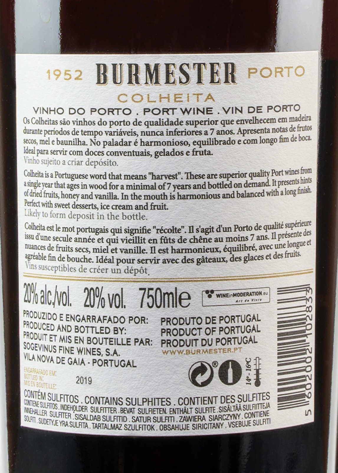 Colheita Port should be stored in a cool and dry place, sheltered from light and temperature fluctuations, and the bottle should remain in an upright position. If stored correctly, Colheita Ports will keep for decades in the bottle. Over time, it is natural that a little sediment will form at the bottom of a bottle of colheita Port wine. Once opened colheita Port should be stored in a fridge and should be consumed within 3 months. Colheita Ports do not require decanting and are best served at a temperature between 14 and 16°C.