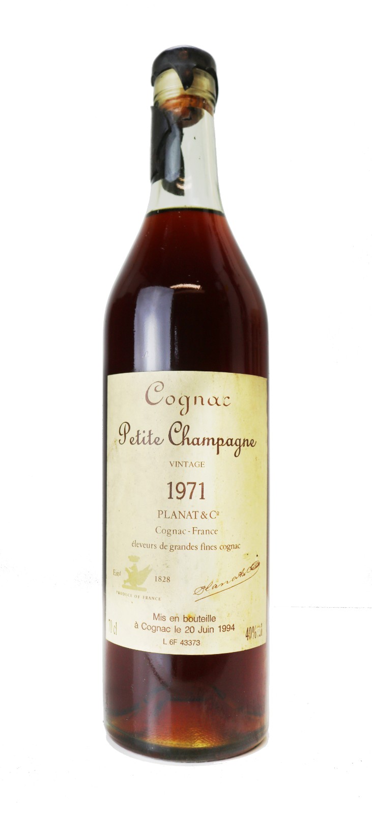 Cognac, 1971 Cognac Petite Champagne Cognac, Planat and Co Bottle size: 75cl ABV: 40% Price: £245.00 Out of stock Description Condition Description Condition Slight bin soiled label Upgrade this item with a Luxury Gift Package Gold Cardboard Presentation Box - £4.45 Single bottle cardboard presentation box. Includes tasting notes and a personal message (can be input in the Personal Gift Message Box at the basket stage).***Please note this product is manufactured to fit a 75cl bottle (50cl and 37.5cl bottles can also be packaged inside this box). Out of Stock Single Bottle Black Wooden Box with Sliding Lid - £7.95 Sliding lid wooden gift box with straw lining. Includes tasting notes and a personal message (can be input in the Personal Gift Message Box at the basket stage).***Please note this product is manufactured to fit a 75cl bottle (50cl and 37.5cl bottles can also be packaged inside this box). Out of Stock Single Bottle Natural Wooden Box with Sliding Lid - £7.95 Sliding lid wooden gift box with straw lining. Includes tasting notes and a personal message (can be input in the Personal Gift Message Box at the basket stage).***Please note this product is manufactured to fit a 75cl bottle (50cl and 37.5cl bottles can also be packaged inside this box). Out of Stock Deluxe Gift box with Accessories - £14.95 Send your wine in a beautiful silk-lined gift Box with an accessories set inlaid into the lid. Includes: Corkscrew; Wine Pourer; Thermometer and Wine Stopper. Includes tasting notes and a personal message (can be input in the Personal Gift Message Box at the basket stage).***Please note this product is manufactured to fit a 75cl bottle (50cl and 37.5cl bottles can also be packaged inside this box). Out of Stock You might also be interested in: View Last one Cognac, 1935 Harveys Grand Champagne Cognac Bottled in 1964 This rare vintage Cognac was distilled in 1935 and matured for almost three decades in oak casks before … £725.00 View Last one Cognac, 1865 Fine Old Liqueur Brandy, Cognac Learn more about Cognac< … £1,395.00 View Last one Cognac, 1893 Fine Champagne Cognac Private reserve Cognac, 1893Fine Champagne CognacPrivate ReserveThe 1893 vintage in Cognac dates from the closing … £1,695.00 View New Last one Cognac, 1875 A Marie Brizard & Roger Fine Champagne Cognac, vintage 1875, importers Holborn & Frascati Ltd Cognac, 1875A Marie Brizard & Roger Fine Champagne CognacVintage 1875The 1875 vintage belongs … £1,895.00