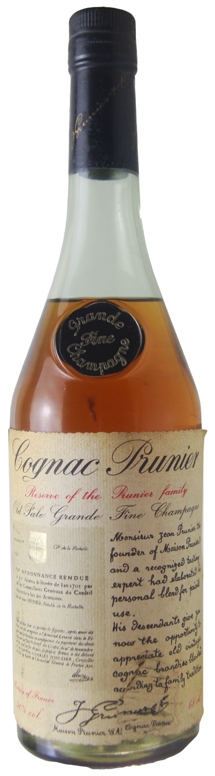 We estimate that this bottle of Prunier Old Pale Fine Champagne Cognac from France was bottled in the early 1970s.