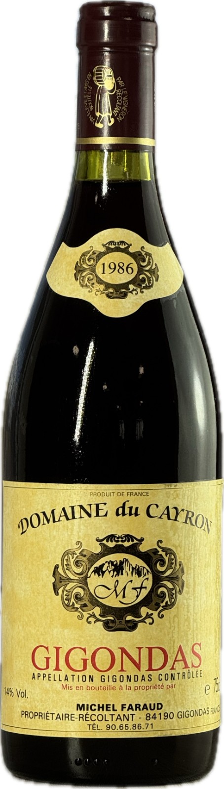 This rare 1986 Gigondas from Domaine du Cayron, crafted by Michel Faraud, is a fine example of old-vine Southern Rhône winemaking. Domaine du Cayron, a historic family estate, is renowned for producing traditional, age-worthy Gigondas wines from Grenache, Syrah, Cinsault, and Mourvèdre grown on limestone and clay soils at the foot of the Dentelles de Montmirail.