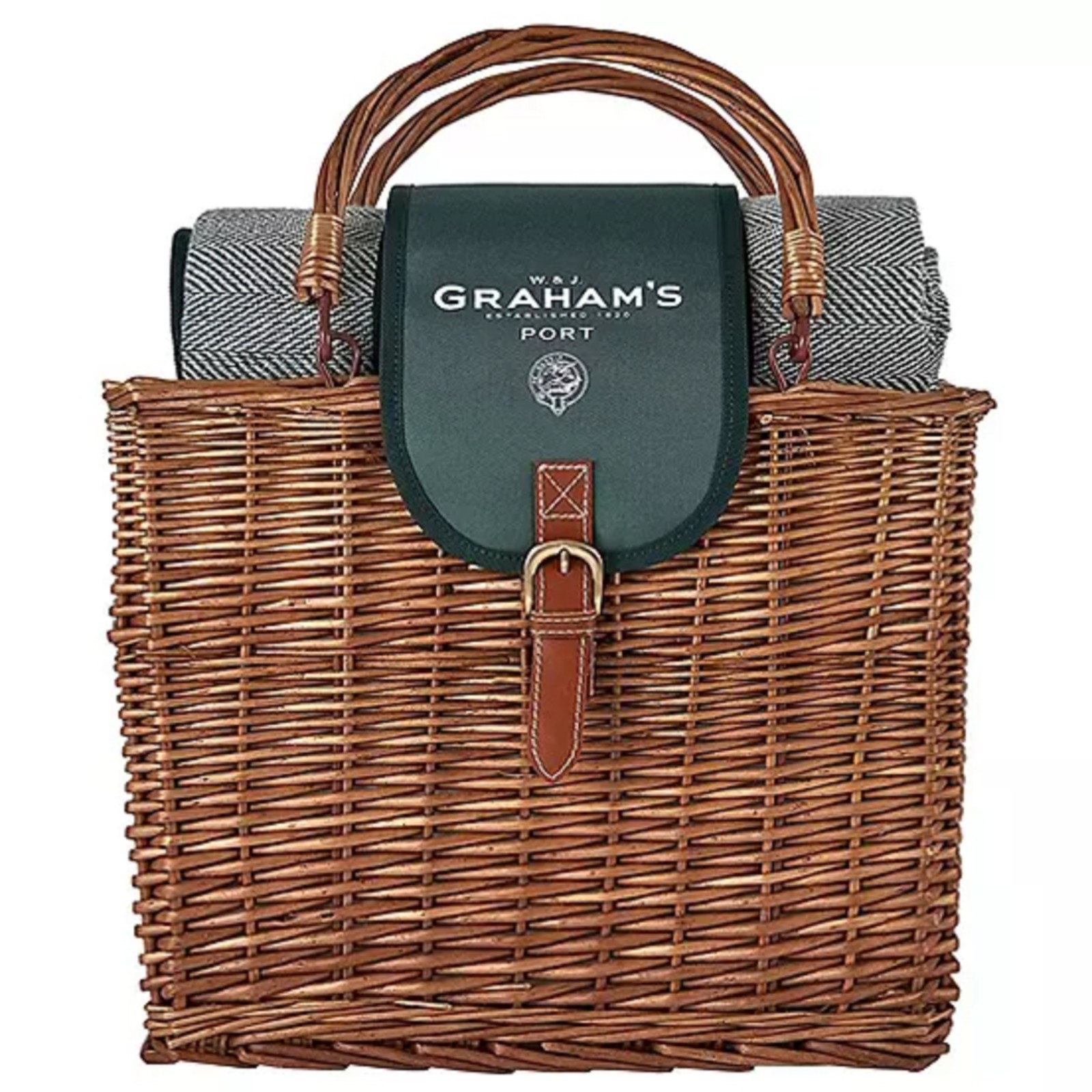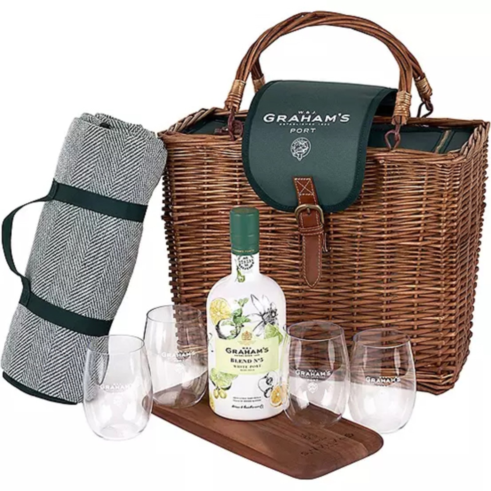 This Graham’s White Port Picnic Hamper is the perfect way to bring your loved ones together. This beautifully-made classic willow hamper is complete with a large picnic rug, 4r stemless unbreakable glasses, a fruit chopping board and a 75cl bottle of Graham’s Blend No.5 White Port. Perfect for Al Fresco dining. Graham’s Blend No.5 White Port has a light, floral finish which makes it perfect for mixing. Ideally served chilled over ice, with tonic water, a slice of lemon and fresh mint to evoke warm summer days in vibrant Porto in Northern Portugal.