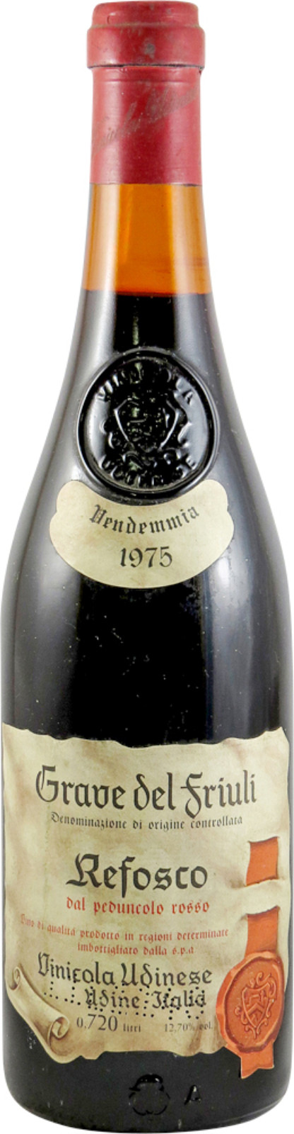 The 1975 Refosco Vinicola Udinese is a beautifully aged expression of this indigenous Friulian grape variety. Over the years, it has developed a complex profile, with aromas of dried dark fruits like blackberries and plums, complemented by earthy notes of leather, tobacco, and subtle spice. The tannins, which can be firm in younger Refosco wines, have softened gracefully with age, resulting in a smoother and more integrated texture. The acidity remains balanced, offering freshness and structure. This wine has matured well, showing depth and sophistication.