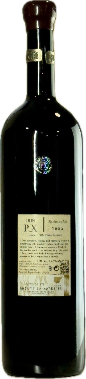 Don PX Selección 1965 Magnum from Bodegas Toro Albalá is an extraordinary aged Pedro Ximénez, drawn from a historic vintage and bottled in an impressive 1.5L format. This wine was aged in seasoned oak casks for decades, undergoing a slow oxidative maturation process that built layer upon layer of complexity. The magnum bottling ensures additional freshness and ageing potential, making it a rare and valuable find for collectors and connoisseurs of old fortified wines.
