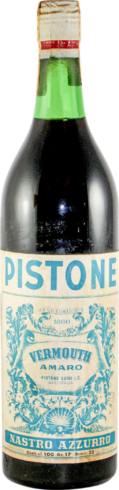The striking turquoise-and-white label, with its ornate flourishes and bold “PISTONE” branding, is unmistakably mid-century in style. The proud designation “Nastro Azzurro” (Blue Ribbon) would have been a mark of quality, aligning this bottling with Italy’s reputation for excellence in vermouth-making.