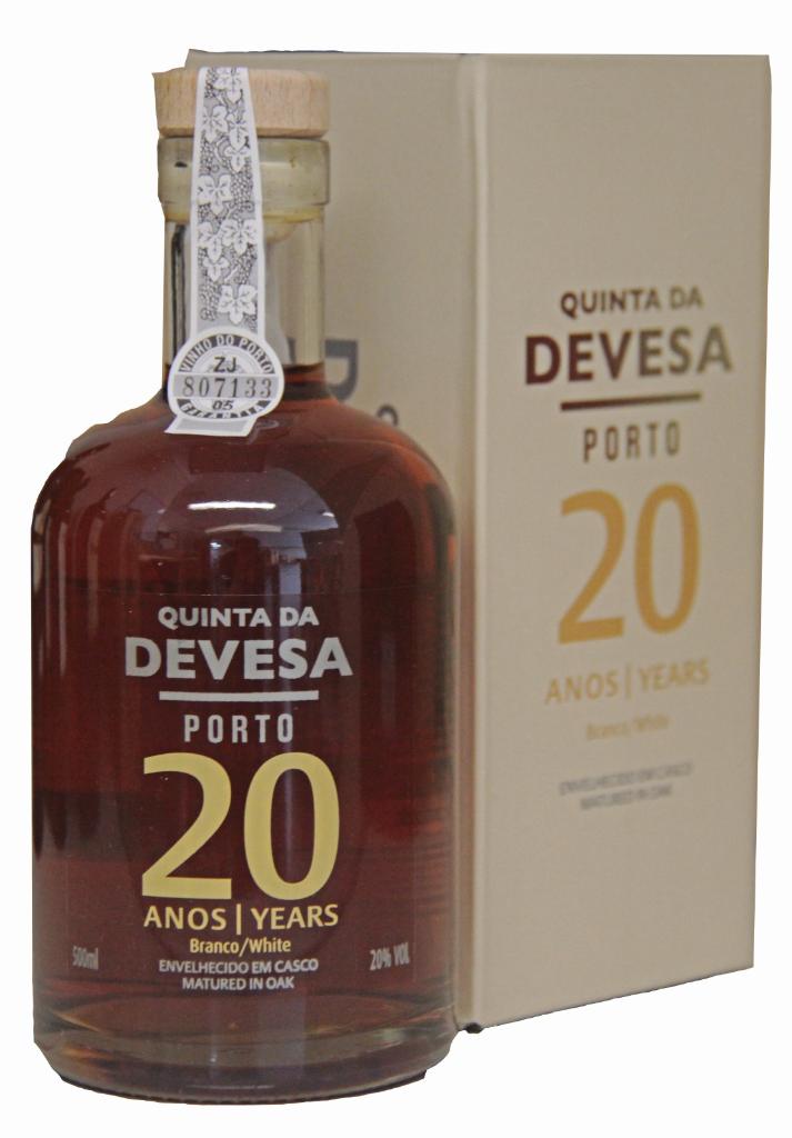 The Quinta da Devesa 20-Year-Old White Port is a distinguished fortified wine from Portugal's Douro Valley, showcasing the estate's commitment to quality and tradition. Crafted from a blend of indigenous white grape varieties, including Côdega de Larinho, Rabigato, and Malvasia Fina, this port is aged for an average of 20 years in French oak casks, resulting in a complex and refined profile.